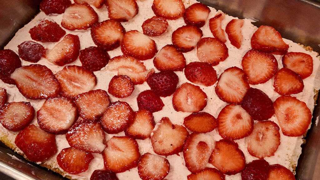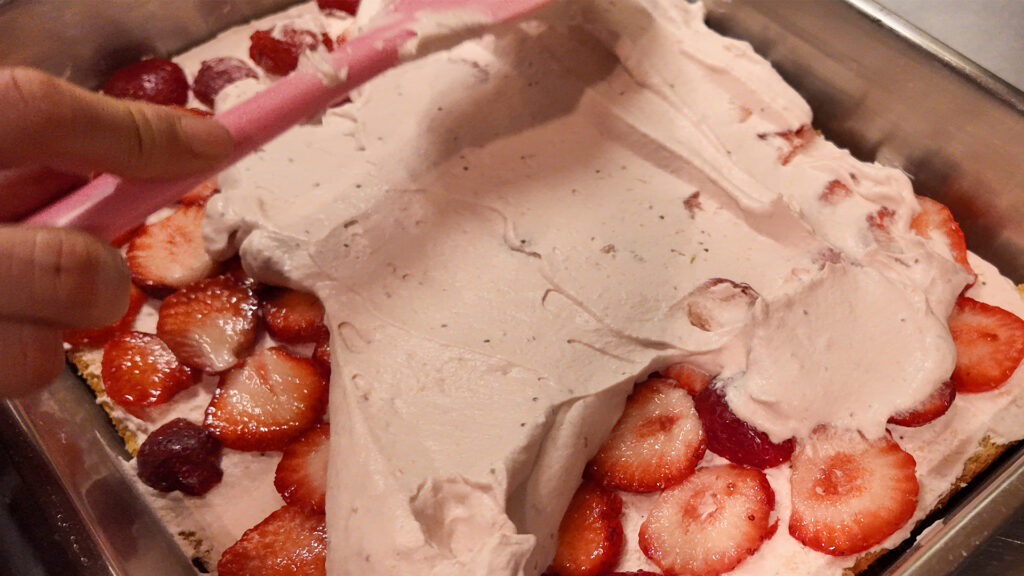 そこでスポンジを4枚にスライスし、層を増やしてみました。いちごクリームといちごの量も、思い切って増やしました。すると、いちごの香りがぐっと際立つケーキになりました。