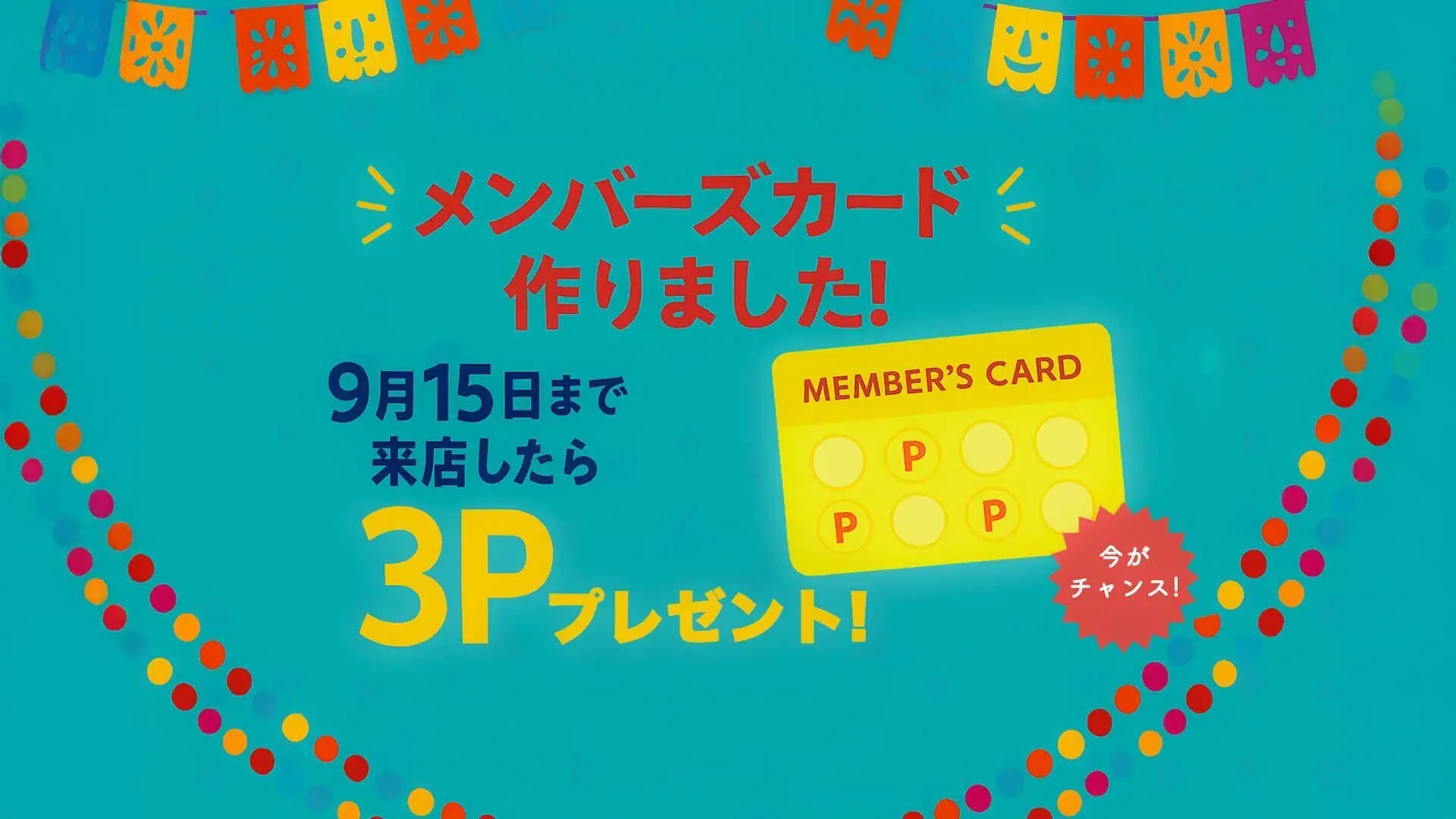 いまなら9月まで来店ごとに3ポイント差し上げます。