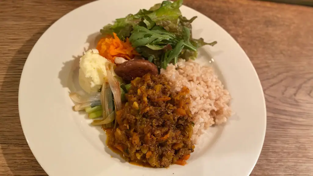 カレーなどのお食事メニューには、玄米ごはんとお野菜の副菜を数種類添えています。