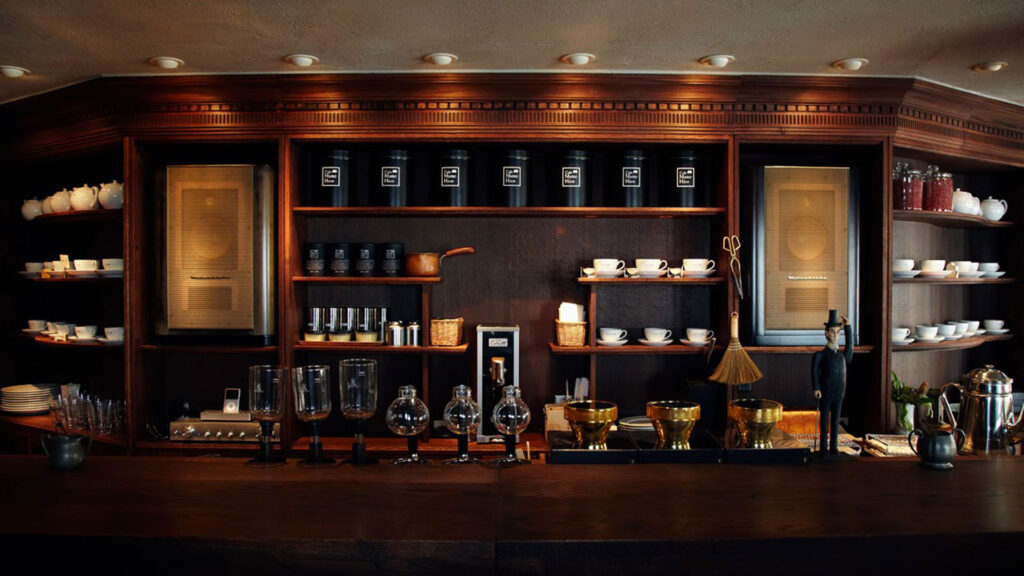 三軒茶屋店の大きな木のテーブル、ダンドウツツジなどグリーンの飾りつけ、手の行き届いた空間。珈琲の香り。スタッフさんとのちょっとした会話。