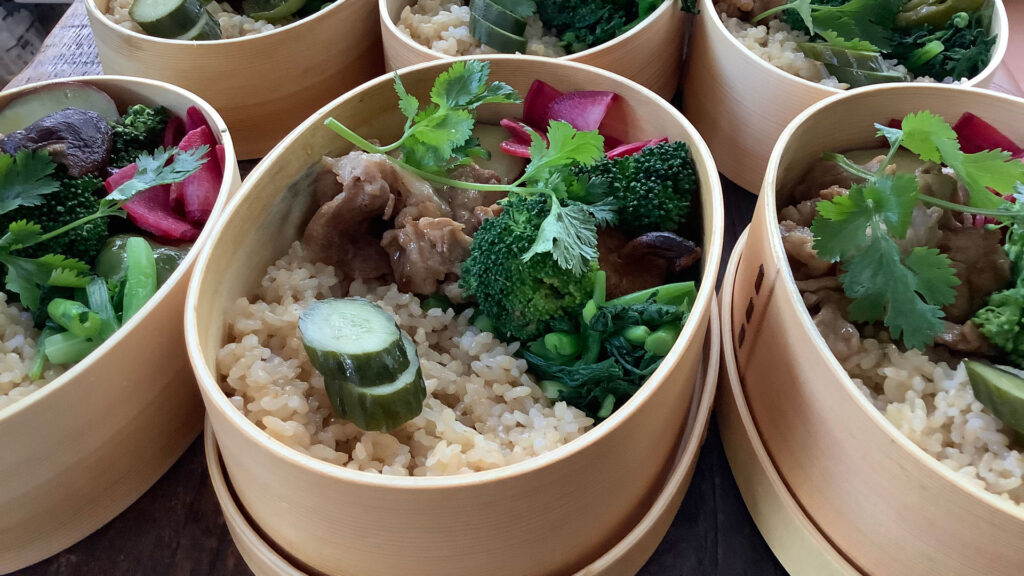 キッチンでは、その場でお肉が焼かれ、ごはんとお惣菜が手際よく詰められて、ほかほかの牛肉弁当が完成。