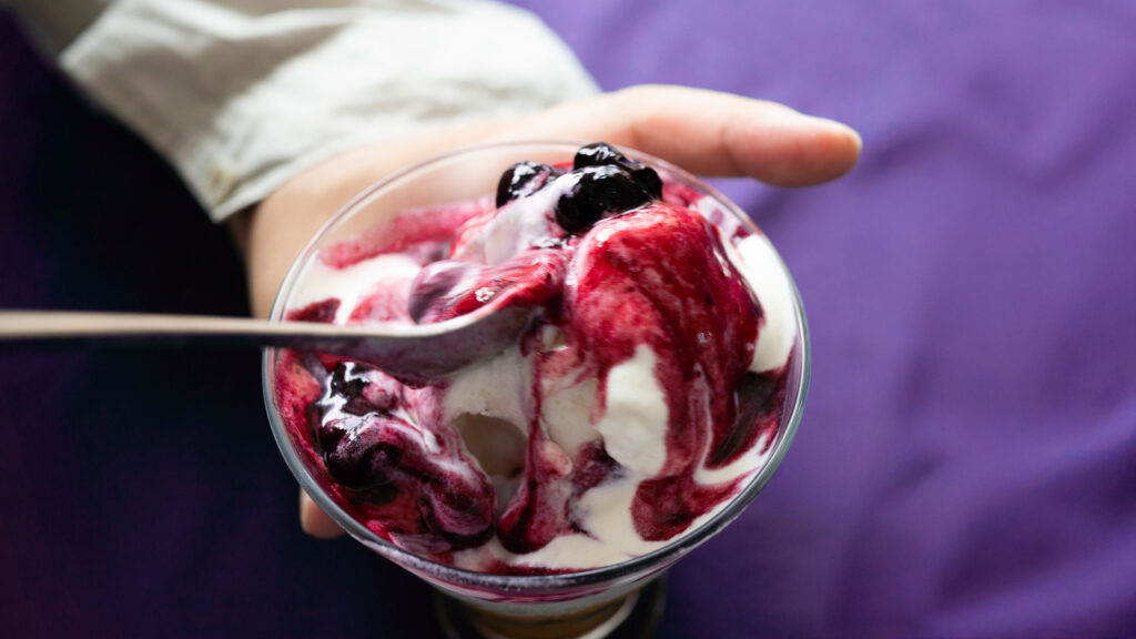 ブルーベリーパフェは、深い紫と白のコントラストが美しく、ちょっとシックな雰囲気。