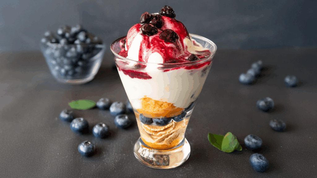 ブルーベリーパフェは、深い紫と白のコントラストが美しく、ちょっとシックな雰囲気。