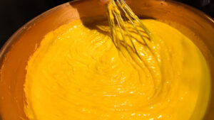 卵を温めながらミキサーで混ぜていくのですが、回すスピードや時間の目安はあっても、その日の卵の冷え具合によって状態は微妙に変わります。