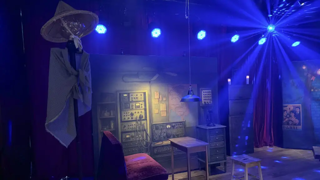 舞台中央には東南アジアの地図と通信機器、ソファーにテーブル、舞台脇には軍部の敬礼するポスターとグラスを持つ人々のポスター、そしてスタンドマイク。