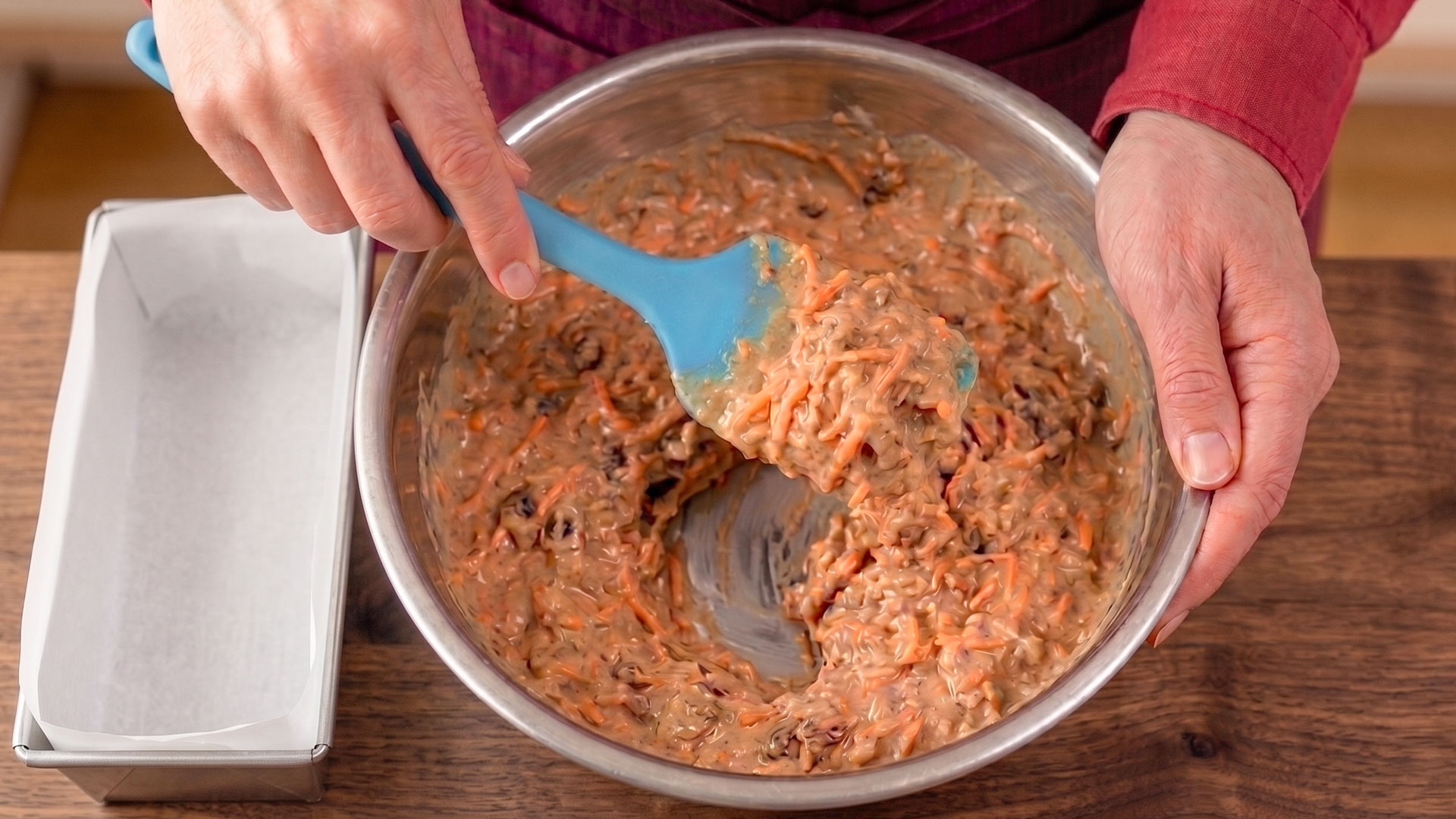 生地には、にんじんに加えて、パイナップル、ラムレーズン、胡桃をたっぷりと練り込んでいます。パイナップルの酸味、ラムレーズンの甘みと深い香り、胡桃の歯ごたえと香ばしさ。それぞれが違う役割を持ちながら、ひとつの味としてまとまっていきます。